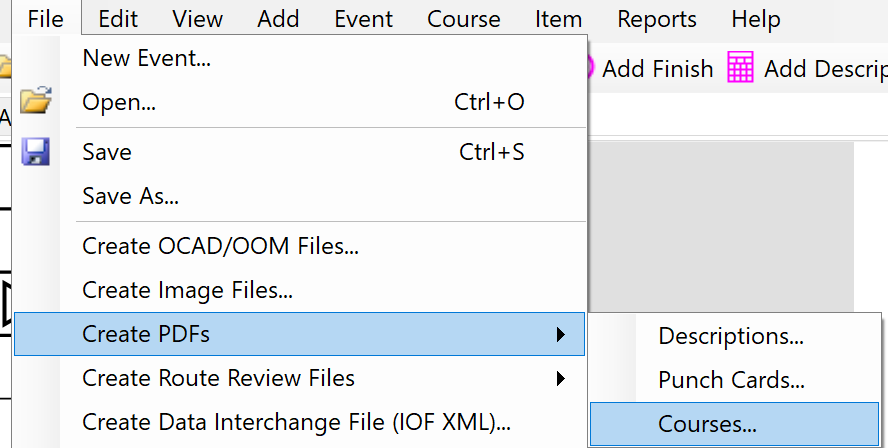 To create PDFs files of your course(s) in Purple Pen, hover over Create PDFs from the File menu and pick the Courses... option. Do NOT try to use other methods such as printing to the Microsoft Print to PDF printer (or, worse, invent your own method - we have seen JPEGs being provided as map files which don't even have a scale).